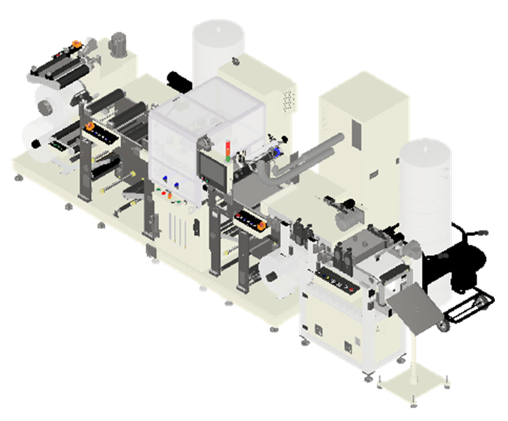 - 將電池極卷複合材料,以伺服馬達連續送料。透過Mark Sensor定位並決定沖切位置,依參數設定數值控制連續沖型之機械。