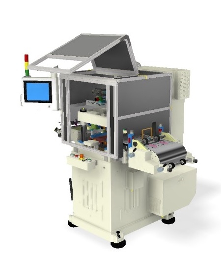 - 適用於捲狀印刷物,搭載CCD視覺辨識對位及高速定位系統偵測靶型偏離位置,並自動移動XYθ座標至修正固定位置後進行沖切作業。